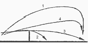 Запомните! И при коротких, и при прострельной подачах надо обязательно сопровождать волан рукой с ракеткой При короткой подаче оно более плавное, при прострельной — более динамичное. Если при прострельной подаче волан летит быстро, на высоте 3—4 м, то при плоской (это тоже весьма неожиданная подача) пролетает низко над сеткой к задней линии площадки соперника.