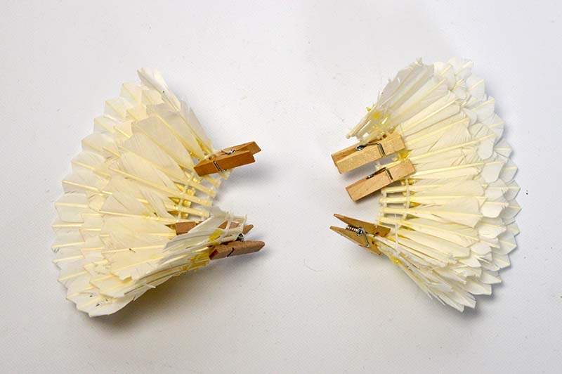 - Приклеиваем три полоски перьев вместе, смещенных один поверх другого. Скрепляем прищепками до полного высыхания, попутно придав крылышкам слегка овальную форму (как у ангела!)