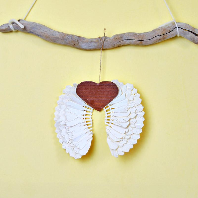 - Вырезаем из картона сердечко (можно покрасить его краской или обклеить цветной бумагой) и приклеиваем пару крыльев с обратной стороны. И снова закрепляем прищепкой!