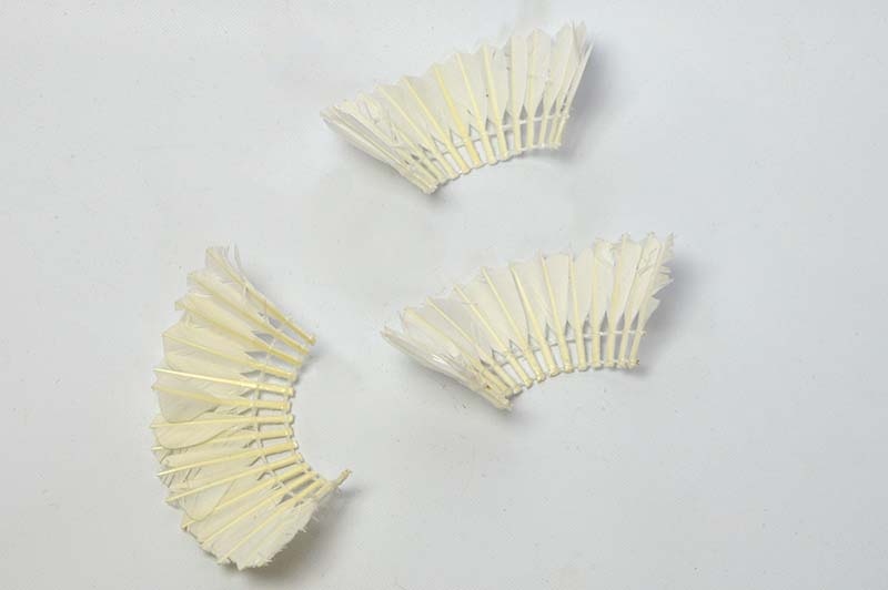 - Сначала отрезаем резиновый и пробковый конец волана и раздвигаем перья в одну полоску. Нам понадобится три полоски перьев для каждого крыла.