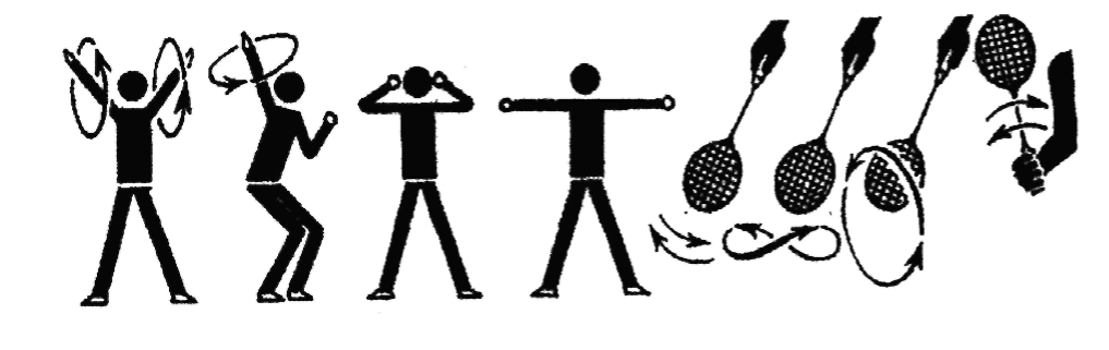 Высокое жонглирование, каждый раз посылая волан вверх как можно выше, с выполнением от 1 до 3 круговых вращений левой рукой в плечевом суставе в различных вариантах или приседания с касанием свободной рукой пола каждый раз после удара по волану.